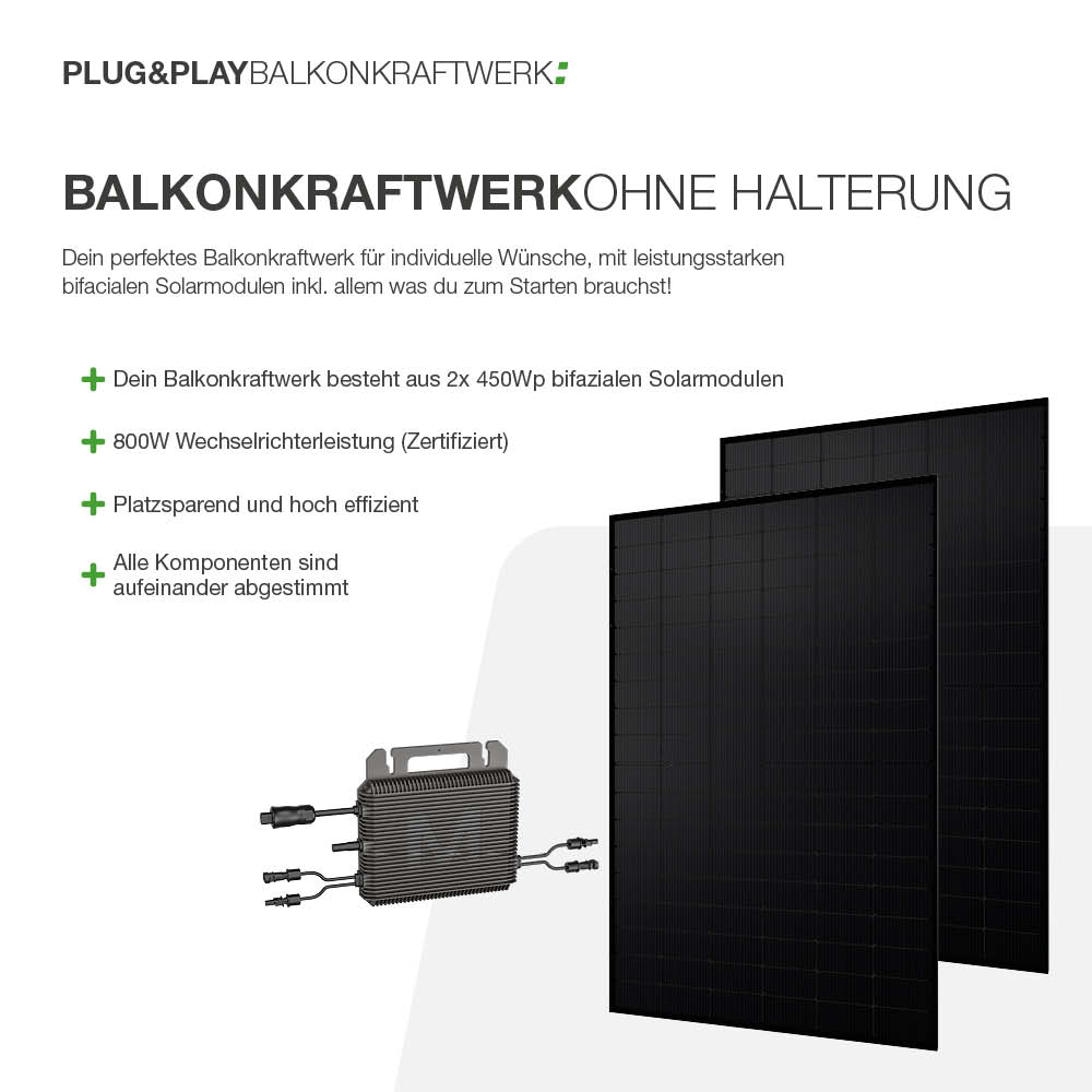 Dein Balkonkraftwerk für dein Zuhause. Mit PLUG&PLAY hast du in wenigen Minuten deinen eigens hergestellten Strom. Einfach auspacken, aufstellen und anstecken, fertig! Dein Basic-Set besteht aus zwei bifazialen Modulen mit je 450 Wp Leistung und einem Mikrowechselrichter 800W mit Wifi. Die notwendigen Anschlusskabel zum Wechselrichter, sind natürlich vormontiert. Wähle für den Anschluss an die Steckdose einfach den passenden Netzstecker aus.